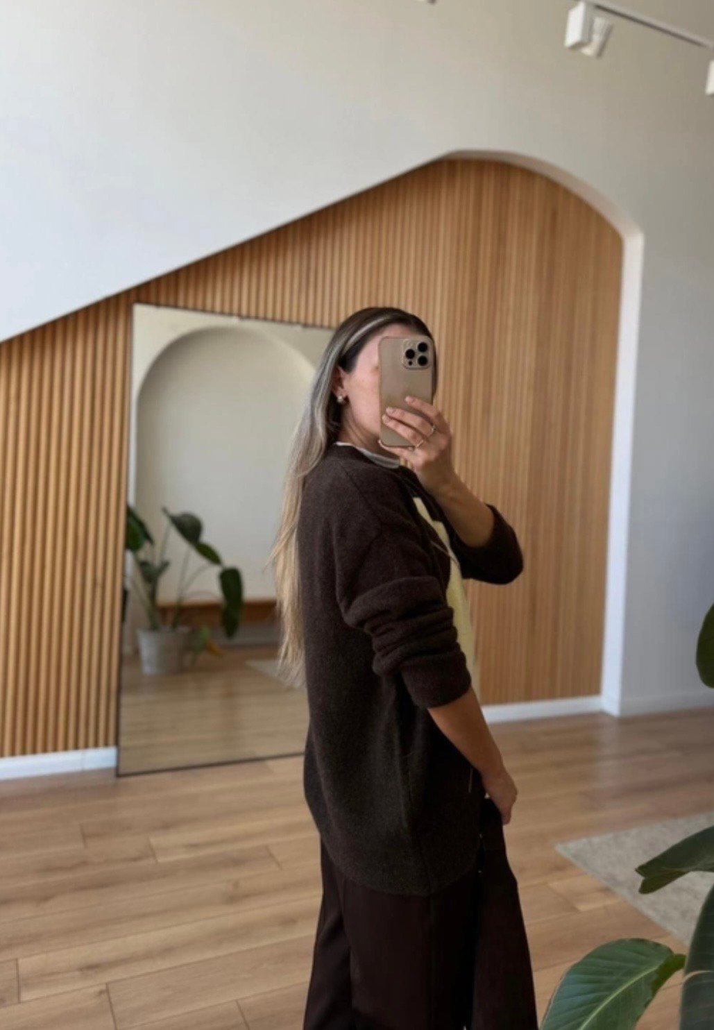 • Donkerbruine trui met groot geel argyle patroon