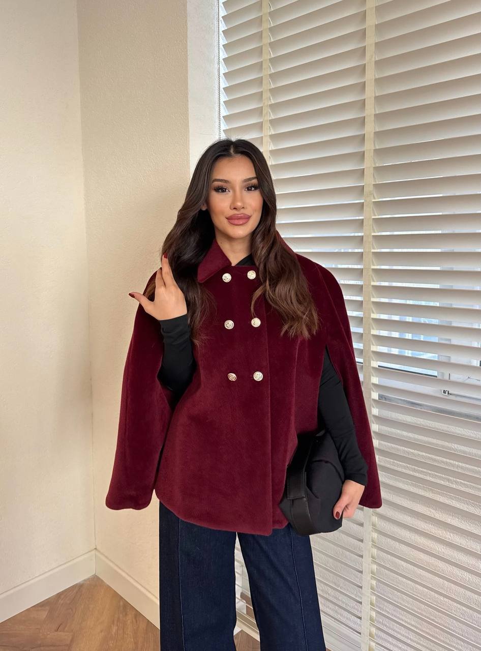 Deze elegante bordeauxrode cape jas voegt een luxe en tijdloze uitstraling toe aan elke outfit. Het zachte, hoogwaardige materiaal zorgt voor comfort en warmte, terwijl de dubbele rij gouden knopen een chique en stijlvolle touch geven.