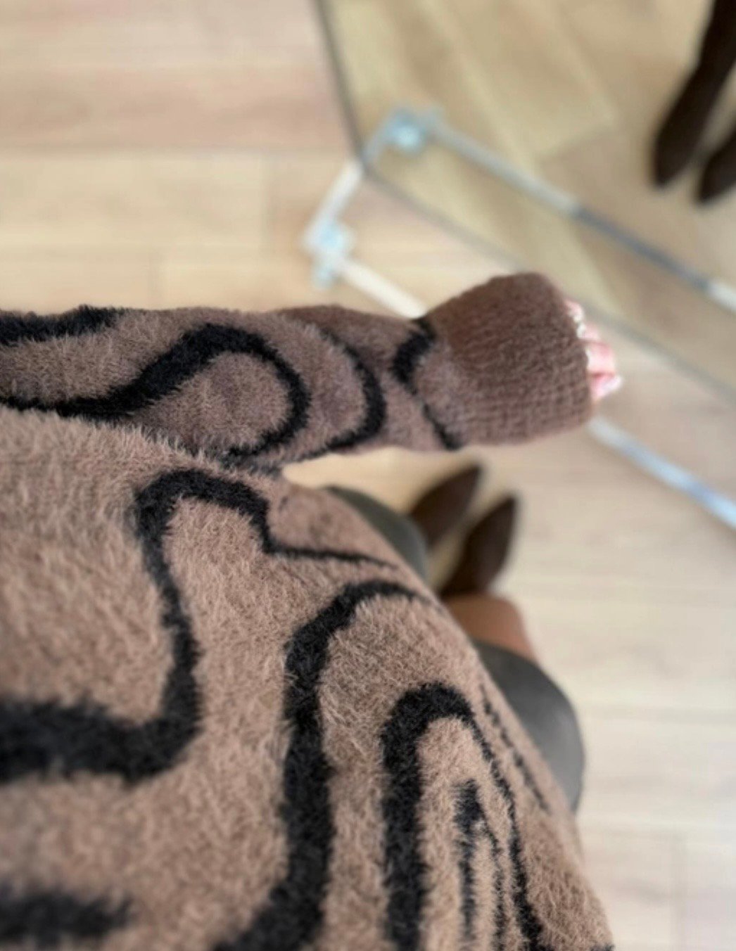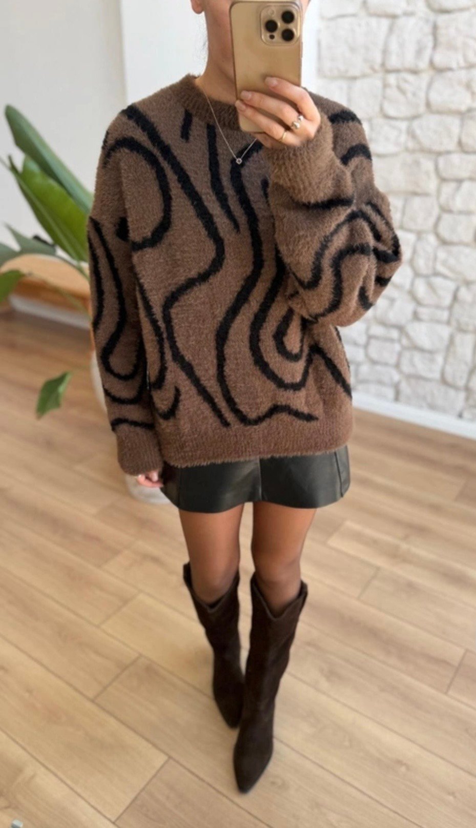 Deze zachte en warme gebreide trui is een echte must-have voor de herfst en winter. De rijke bruine kleur wordt gecombineerd met een opvallend zwart abstract motief, wat de trui een moderne en stijlvolle uitstraling geeft.