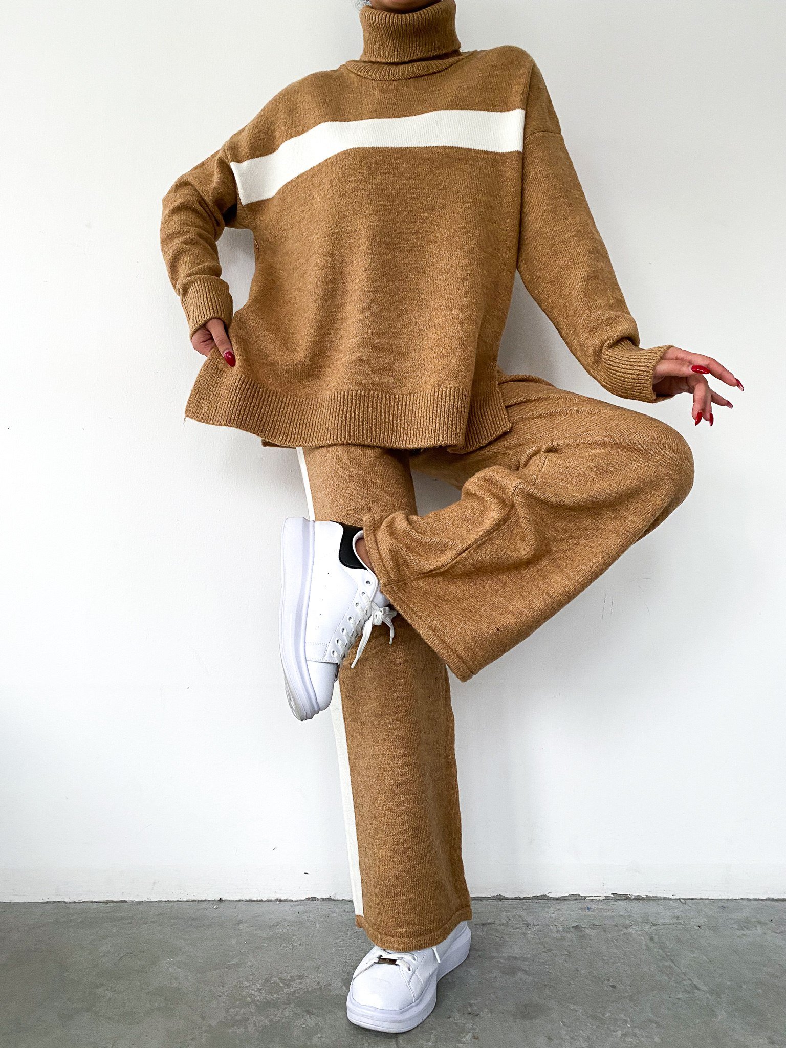 Comfortabele gebreide set met coltrui – Karamel met witte strepen