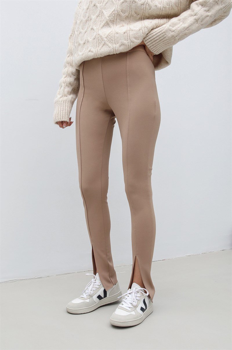 Deze stijlvolle beige legging is een perfecte mix van comfort en trendy details. Het hoge tailleontwerp zorgt voor een slank silhouet, terwijl de subtiele split aan de voorkant een moderne en elegante touch geeft. Dankzij het stretchmateriaal biedt de broek ultiem draagcomfort en bewegingsvrijheid. Ideaal te combineren met truien, blouses of casual sneakers.