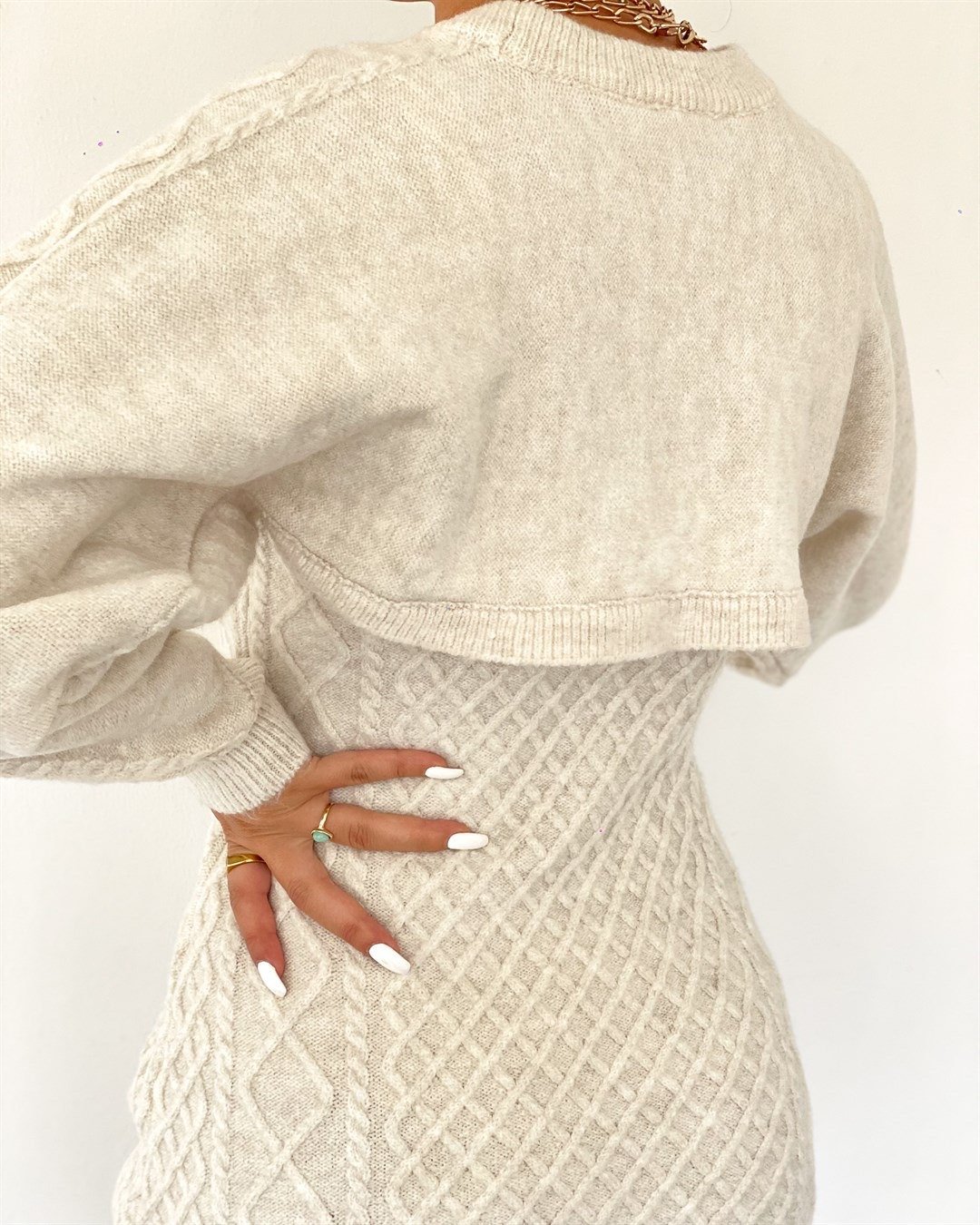 Deze elegante gebreide set combineert comfort met verfijnde stijl. De jurk met fijne breipatronen en vrouwelijke schouderbandjes straalt elegantie uit, terwijl het korte gebreide bolero-jasje een moderne en veelzijdige touch toevoegt. Perfect voor dagelijks gebruik of speciale gelegenheden.