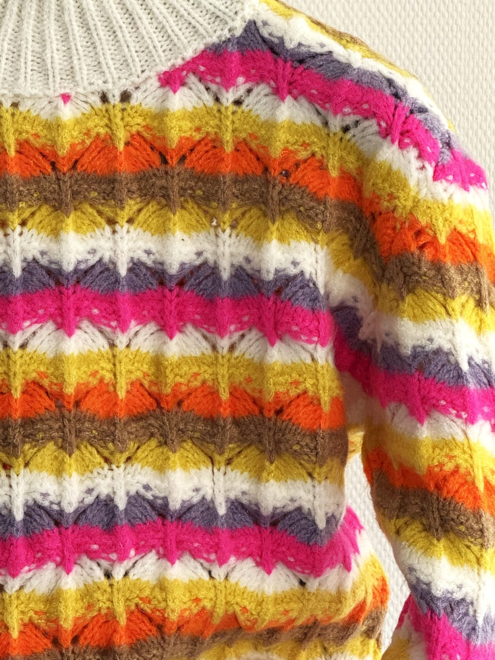 Deze gebreide coltrui met kleurrijke strepen geeft je winteroutfits een vrolijke en energieke uitstraling. De combinatie van geel, roze, oranje, paars en wit zorgt voor een moderne en speelse look. Dankzij de zachte stof blijf je heerlijk warm, terwijl de comfortabele pasvorm ideaal is voor dagelijks gebruik. Perfect te dragen met jeans voor een casual en stijlvolle outfit.