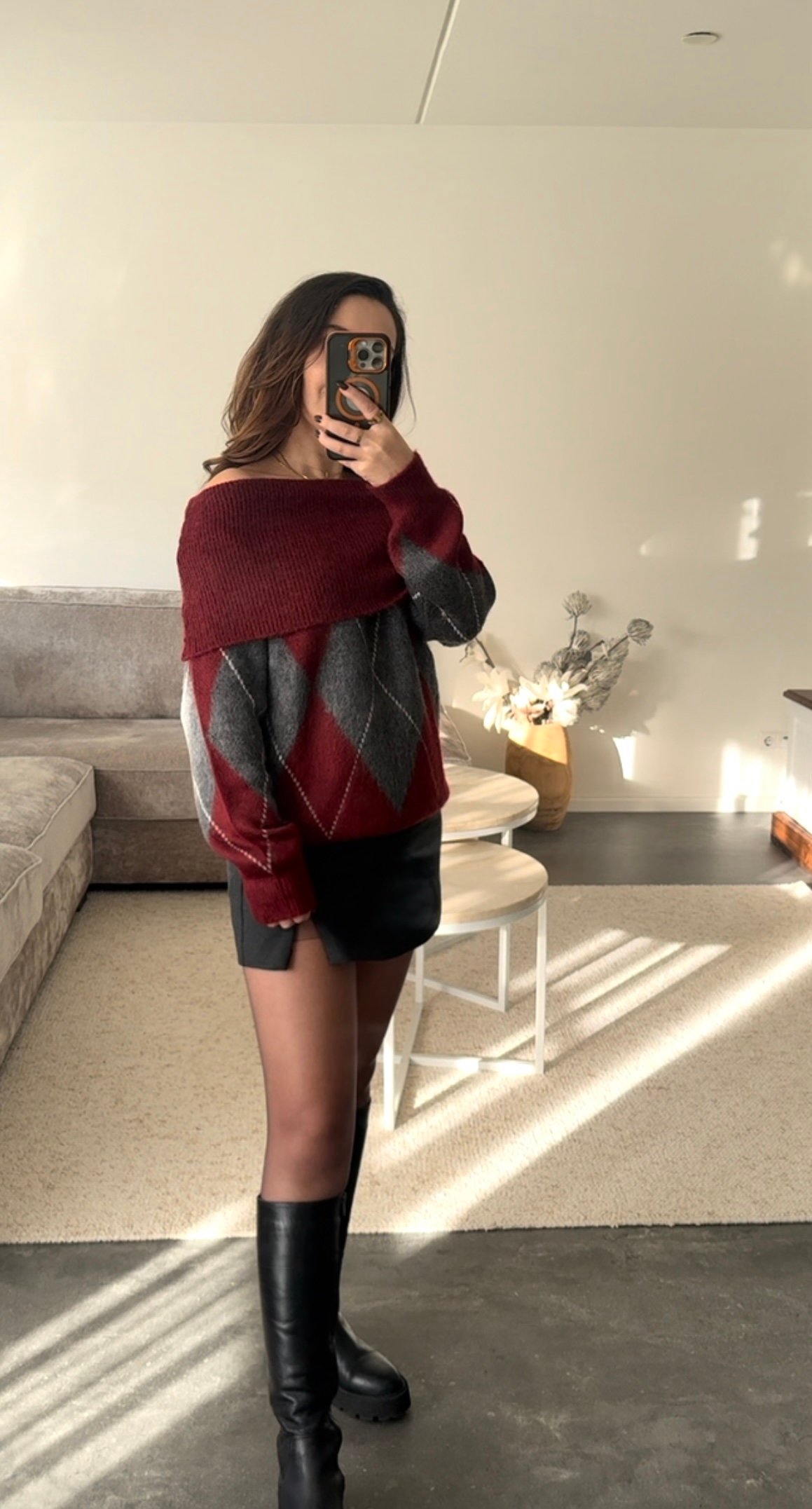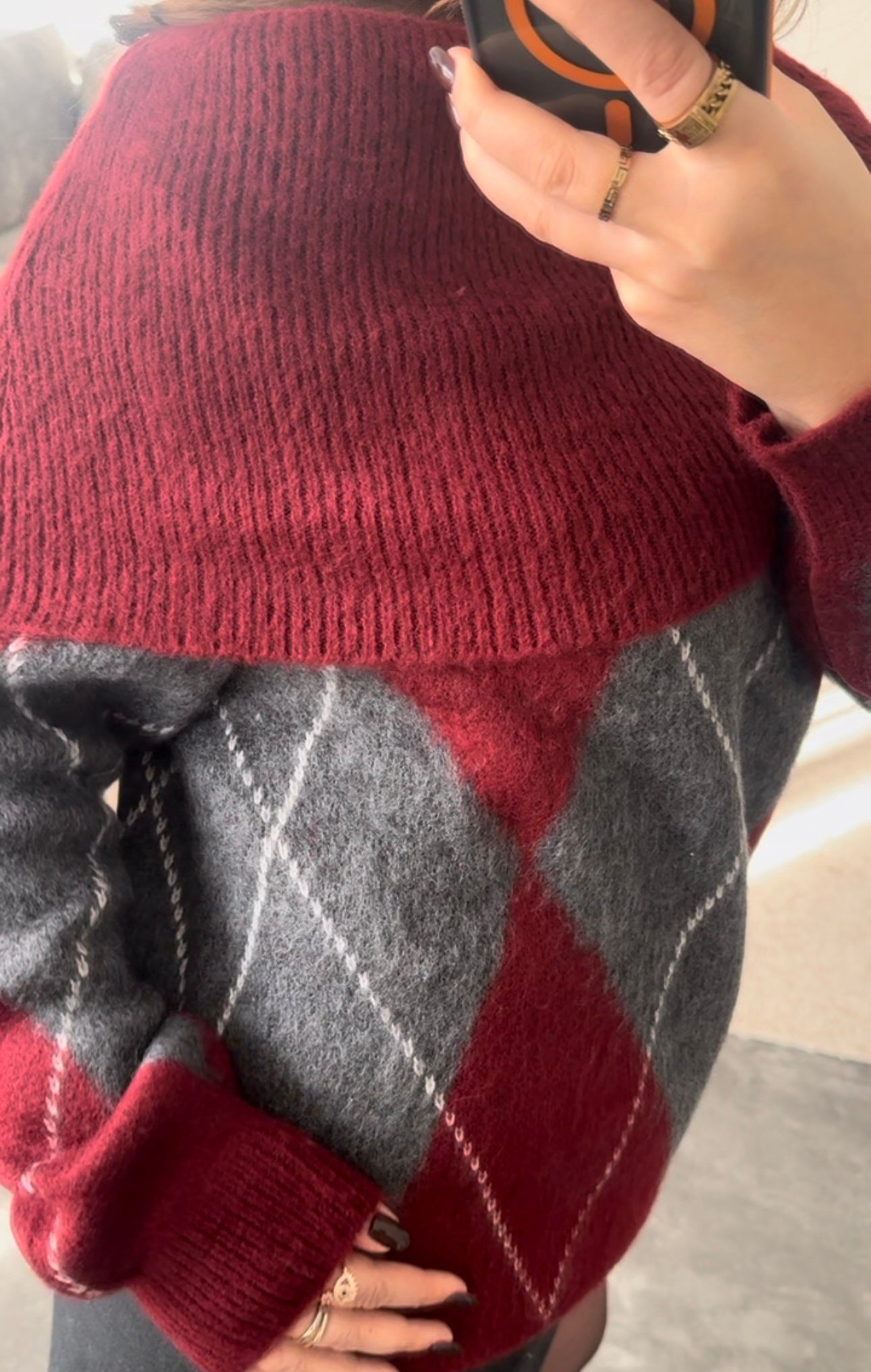 Deze stijlvolle trui met grijs-bordeaux geruit patroon brengt warmte en elegantie perfect samen. Gemaakt van zacht, comfortabel materiaal en ideaal voor zowel casual als nette outfits. Tijdloos design, moderne uitstraling.