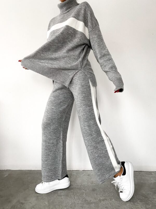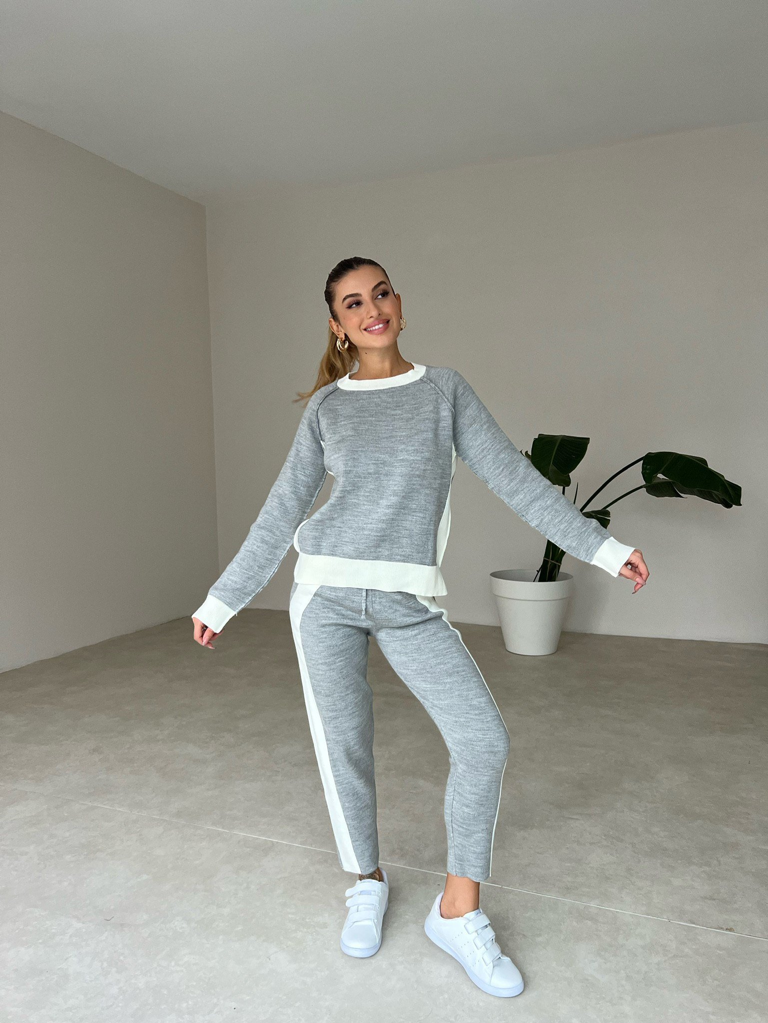 Dit comfortabele en stijlvolle gebreide trainingspak in grijs-wit colourblock design is ideaal voor zowel sportieve als dagelijkse looks. De trui met ronde hals en lange mouwen wordt gecombineerd met een broek met witte zijpanelen, wat zorgt voor een moderne en dynamische uitstraling. Dankzij de zachte gebreide stof voelt het zeer comfortabel aan, terwijl het minimalistische ontwerp een tijdloze elegantie biedt. Perfect te combineren met sneakers, zowel voor thuis als voor een casual dagje uit.