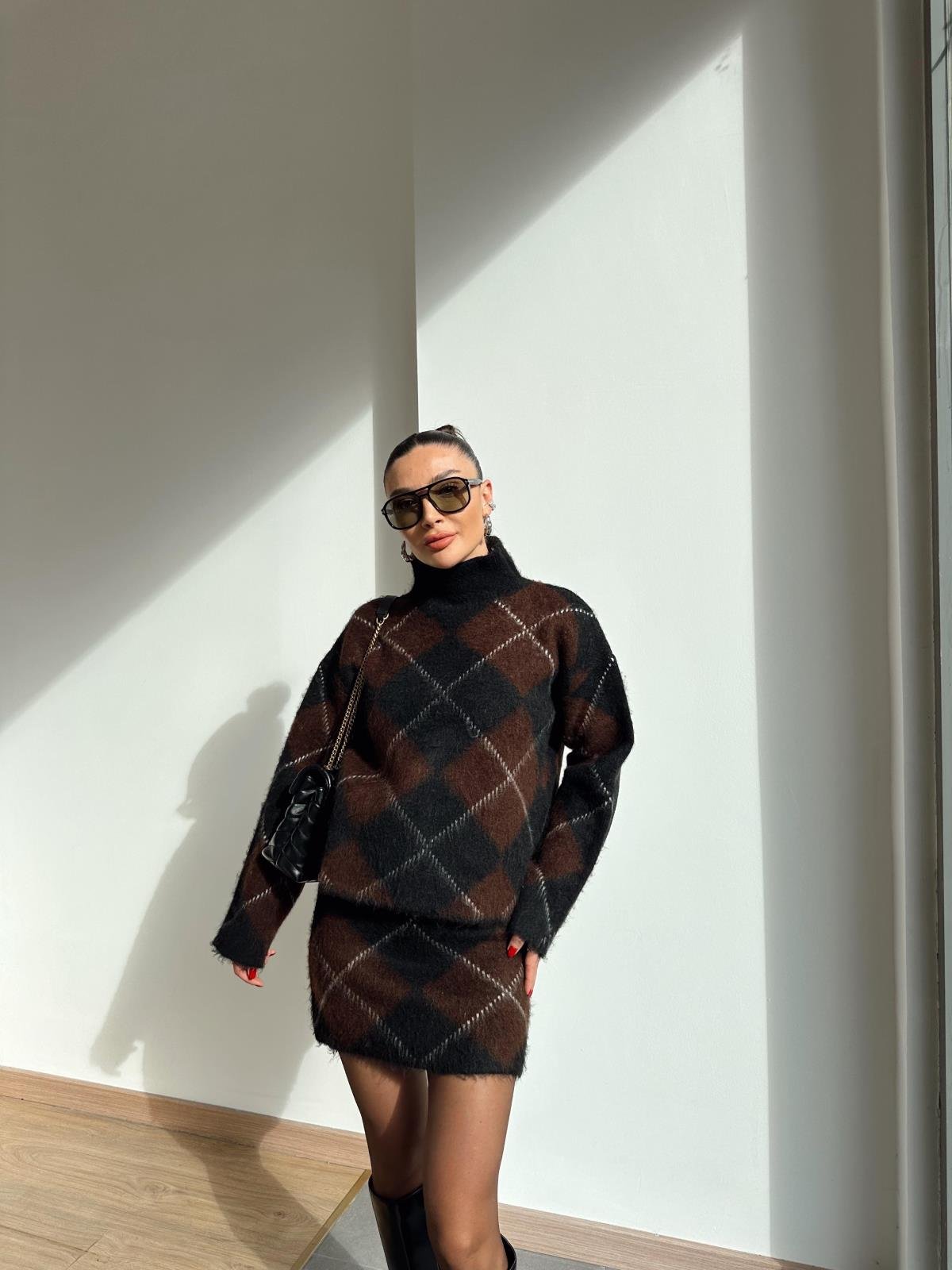 Deze stijlvolle twee-delige set bestaat uit een warme, zachte gebreide trui en een bijpassende minirok met een elegante ruitprint. De comfortabele stof voelt heerlijk aan op de huid en de moderne pasvorm maakt deze outfit perfect voor zowel dagelijks gebruik als een chique gelegenheid. Combineer met hoge laarzen voor een complete, trendy look.