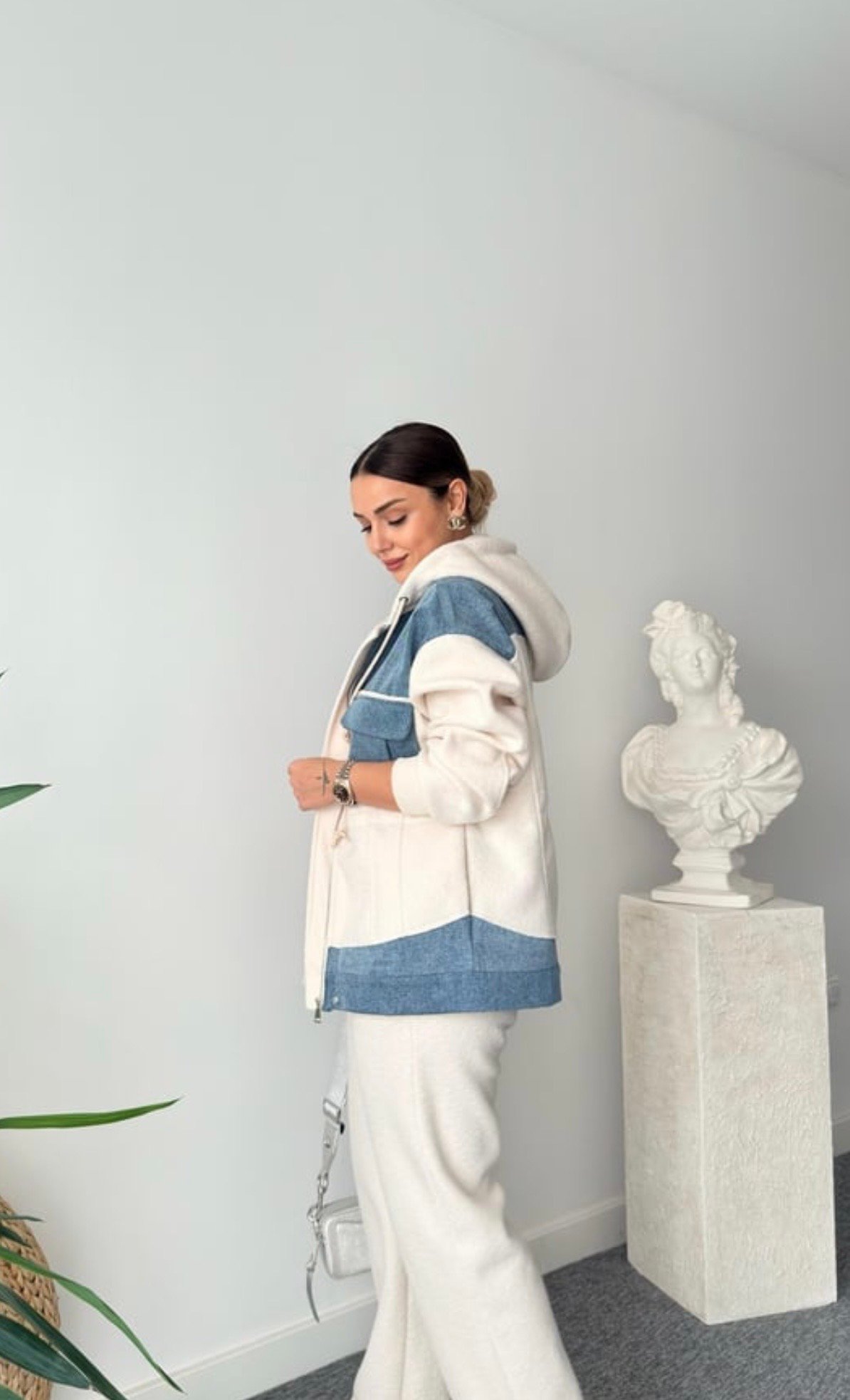 Deze stijlvolle hoodie jas combineert comfort met een moderne, urban uitstraling. Het zachte crèmekleurige materiaal zorgt voor een warm en cozy gevoel, terwijl de denim details op de borst, schouders en zoom de jas een trendy en unieke look geven.