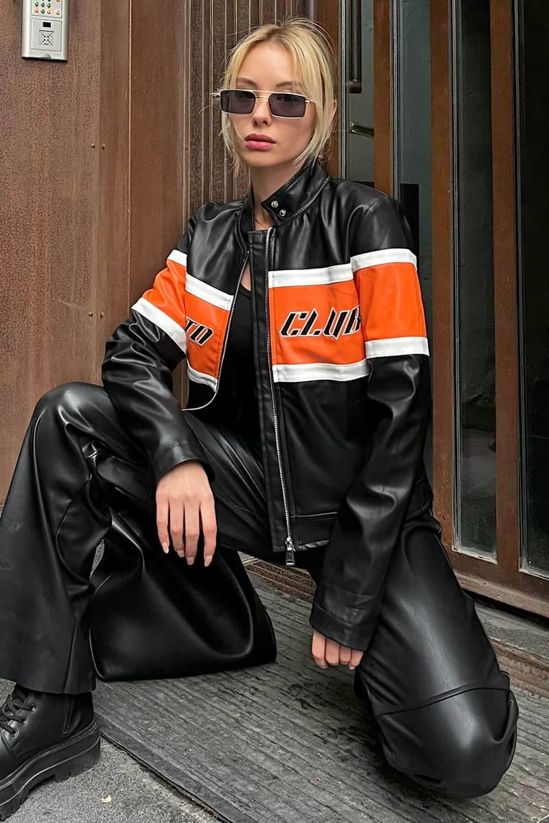 Zwarte Motorstijl Leren Jas met Oranje Strepen