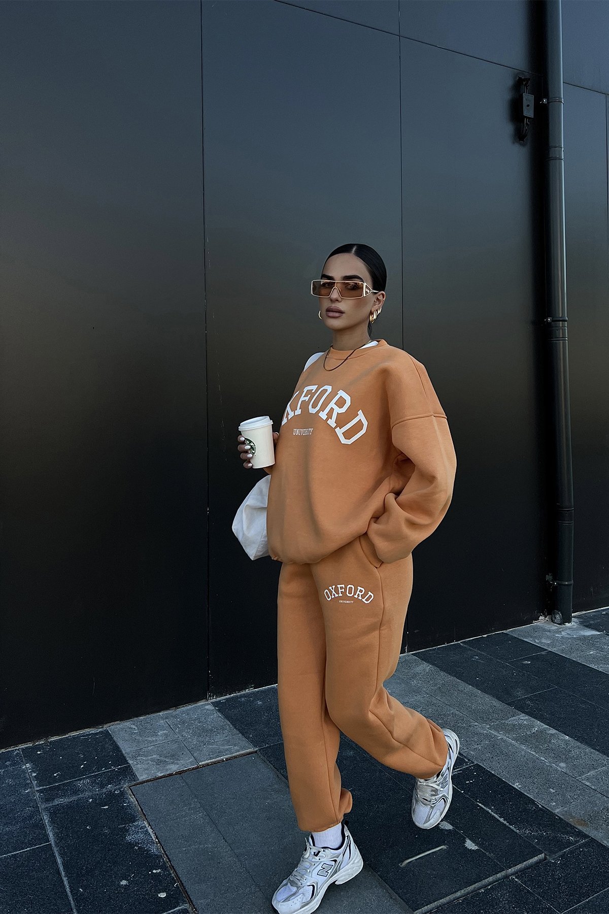 Dit opvallende Oxford set in levendig oranje combineert sportieve flair met ultiem comfort. De oversized sweatshirt met de grote Oxford University print geeft een jeugdige en energieke uitstraling, terwijl de jogger met trekkoord en elastische boorden zorgt voor een perfecte pasvorm. Ideaal voor dagelijks gebruik, waarbij stijl en comfort hand in hand gaan.