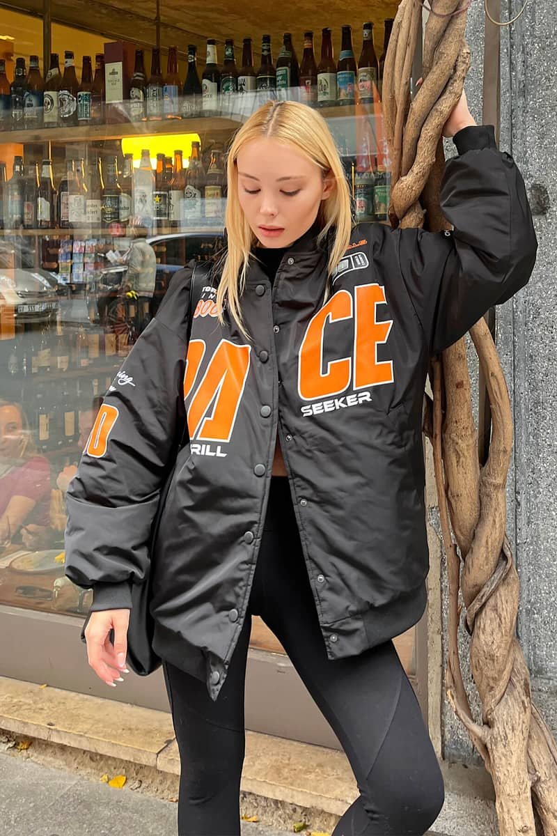 Dit zwarte bomberjack met opvallende raceprints is een echte blikvanger voor liefhebbers van sportieve streetstyle. Het gedurfde ontwerp met grote oranje letters en door motorsport geïnspireerde details geeft het jack een dynamische en unieke uitstraling.