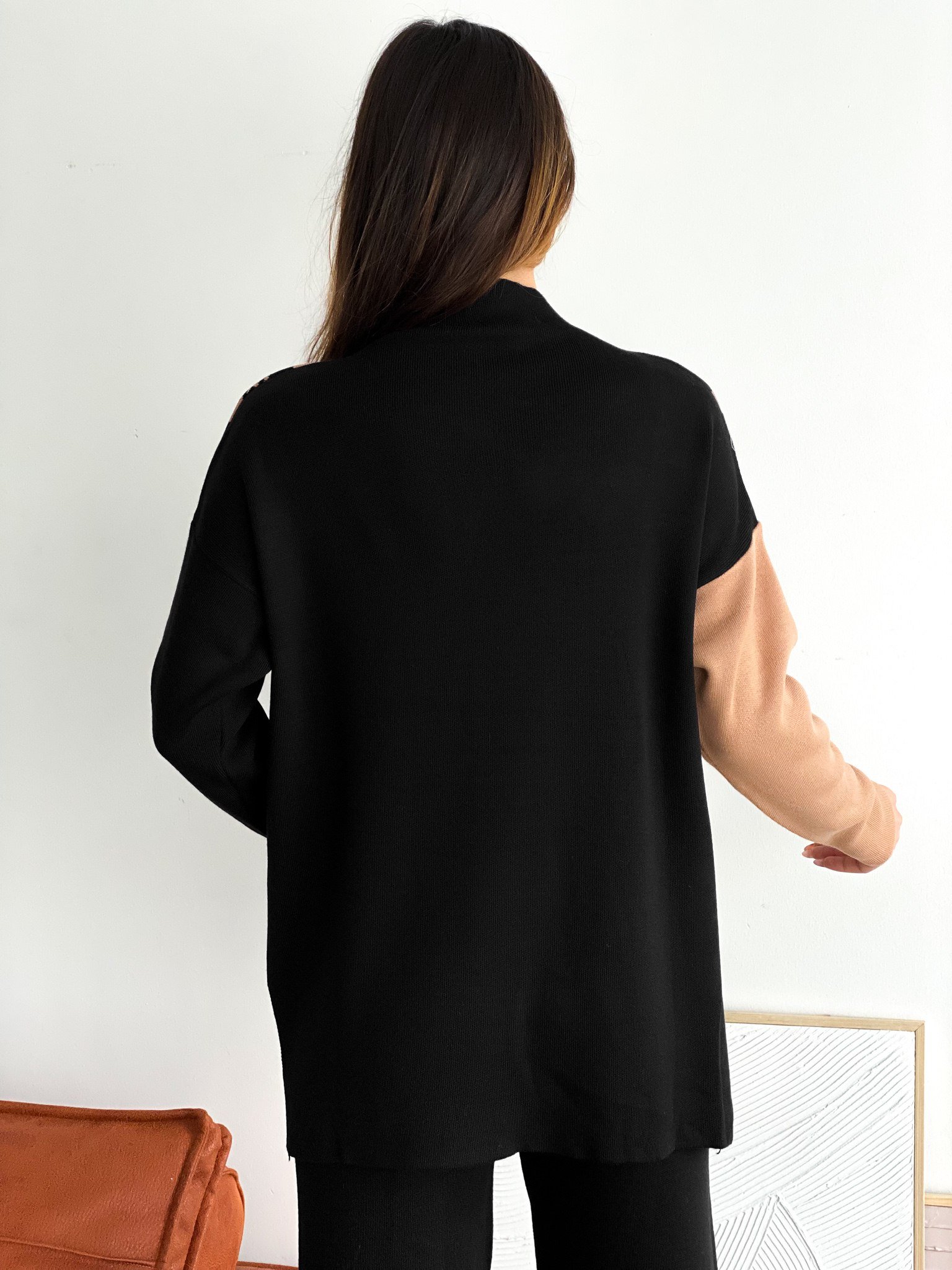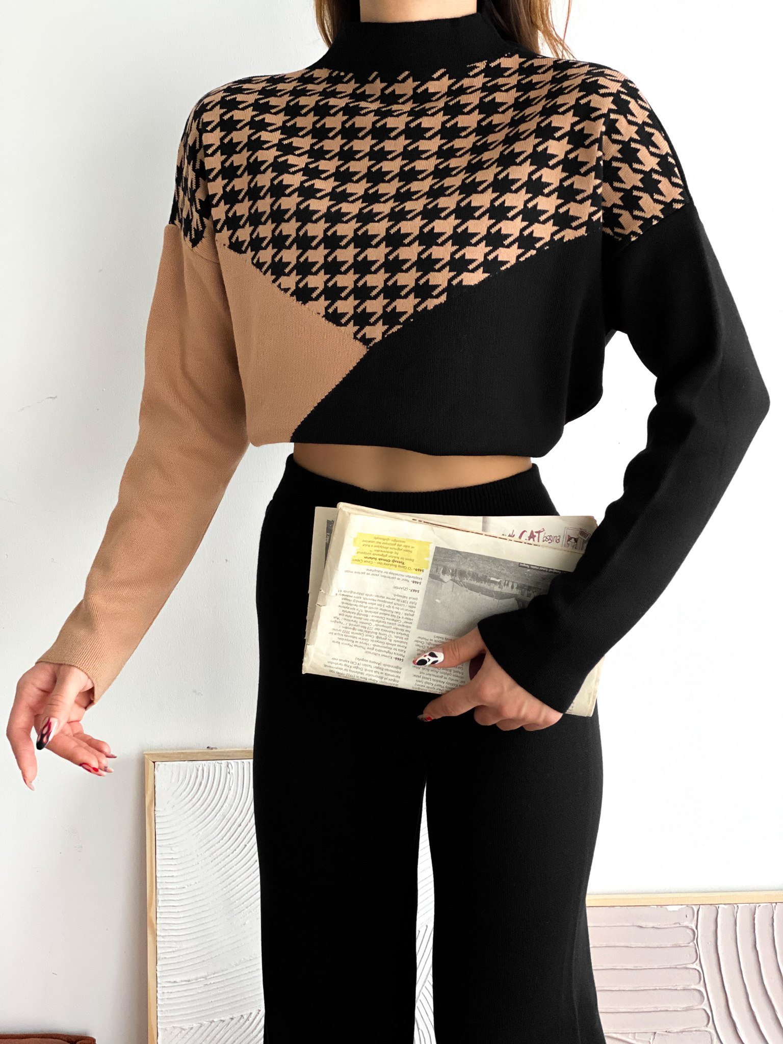 Dit stijlvolle gebreide set combineert moderne elegantie met ultiem comfort. De trui met beige-zwarte pied-de-poule patroon geeft een tijdloze, chique uitstraling, terwijl de losse zwarte broek zorgt voor bewegingsvrijheid en klasse. Perfect voor zowel dagelijks gebruik als voor speciale gelegenheden.