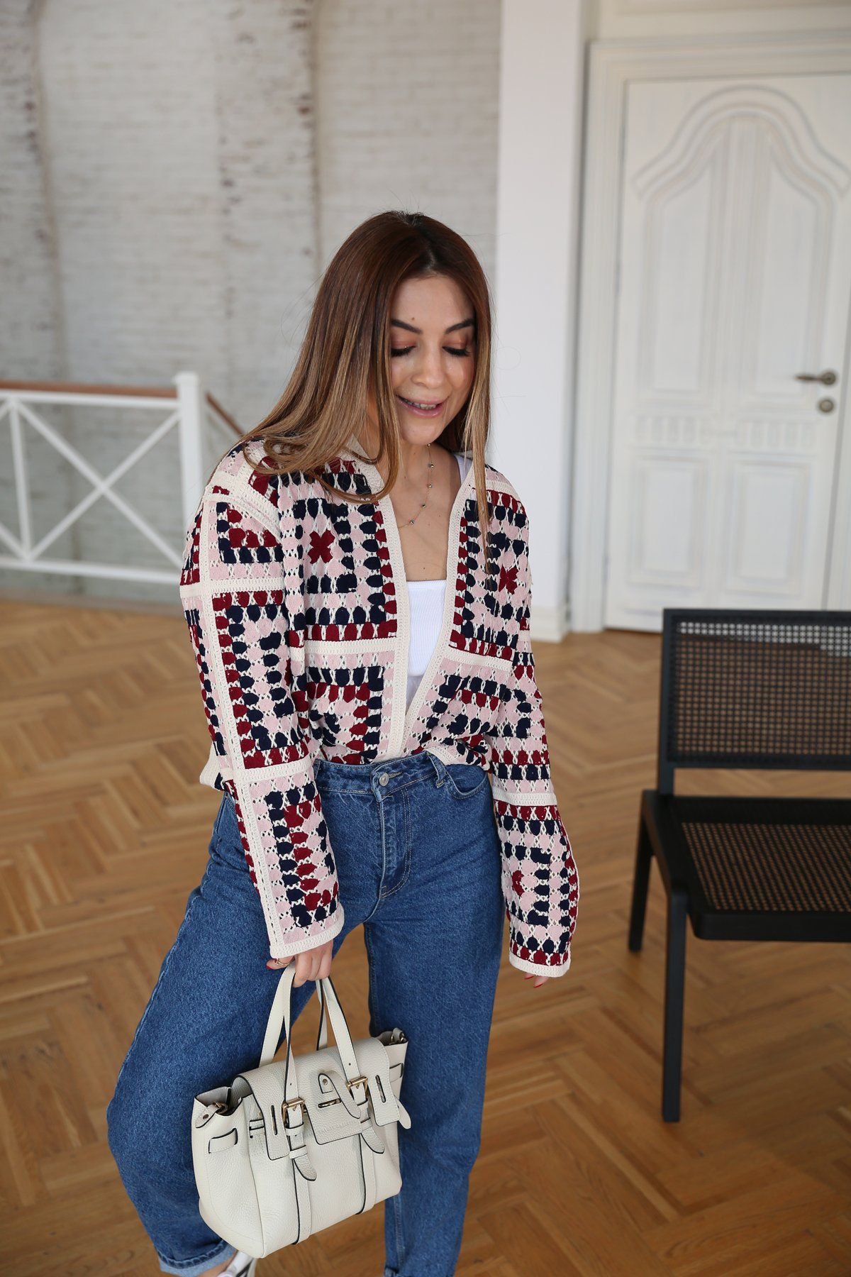 Deze unieke cardigan is een echte blikvanger dankzij het kleurrijke gehaakte patroon in rood, blauw en wit. Het luchtige en zachte materiaal zorgt voor optimaal draagcomfort, terwijl de bohemian uitstraling een speels en trendy accent geeft aan je outfit. Perfect te combineren met jeans voor een casual look of met een rok voor een meer elegante stijl.