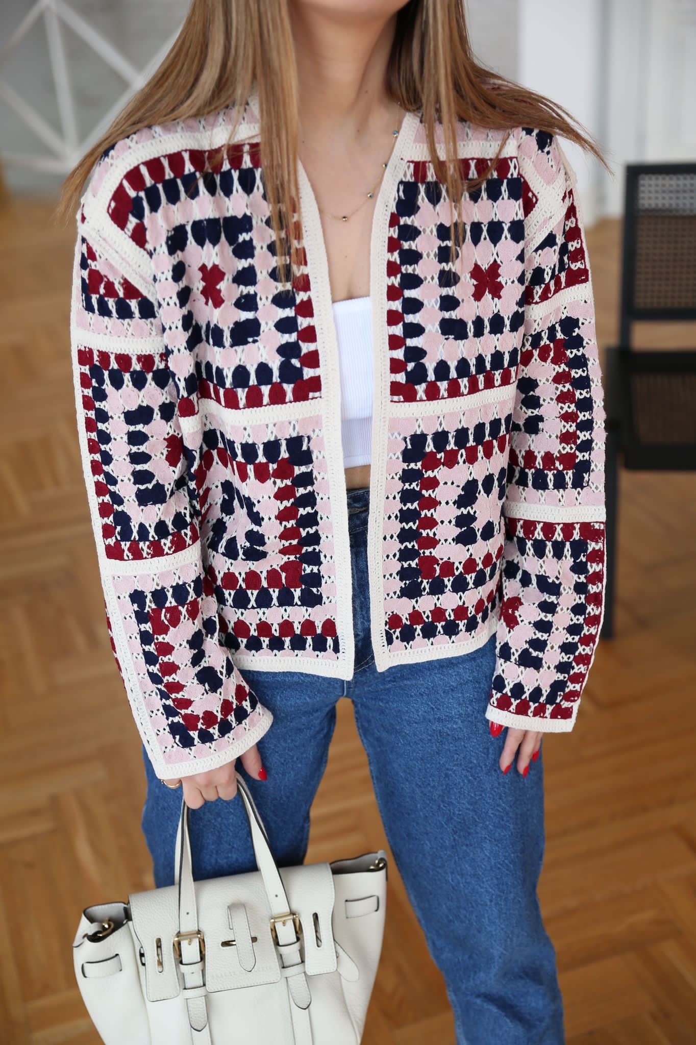 Deze unieke cardigan is een echte blikvanger dankzij het kleurrijke gehaakte patroon in rood, blauw en wit. Het luchtige en zachte materiaal zorgt voor optimaal draagcomfort, terwijl de bohemian uitstraling een speels en trendy accent geeft aan je outfit. Perfect te combineren met jeans voor een casual look of met een rok voor een meer elegante stijl.