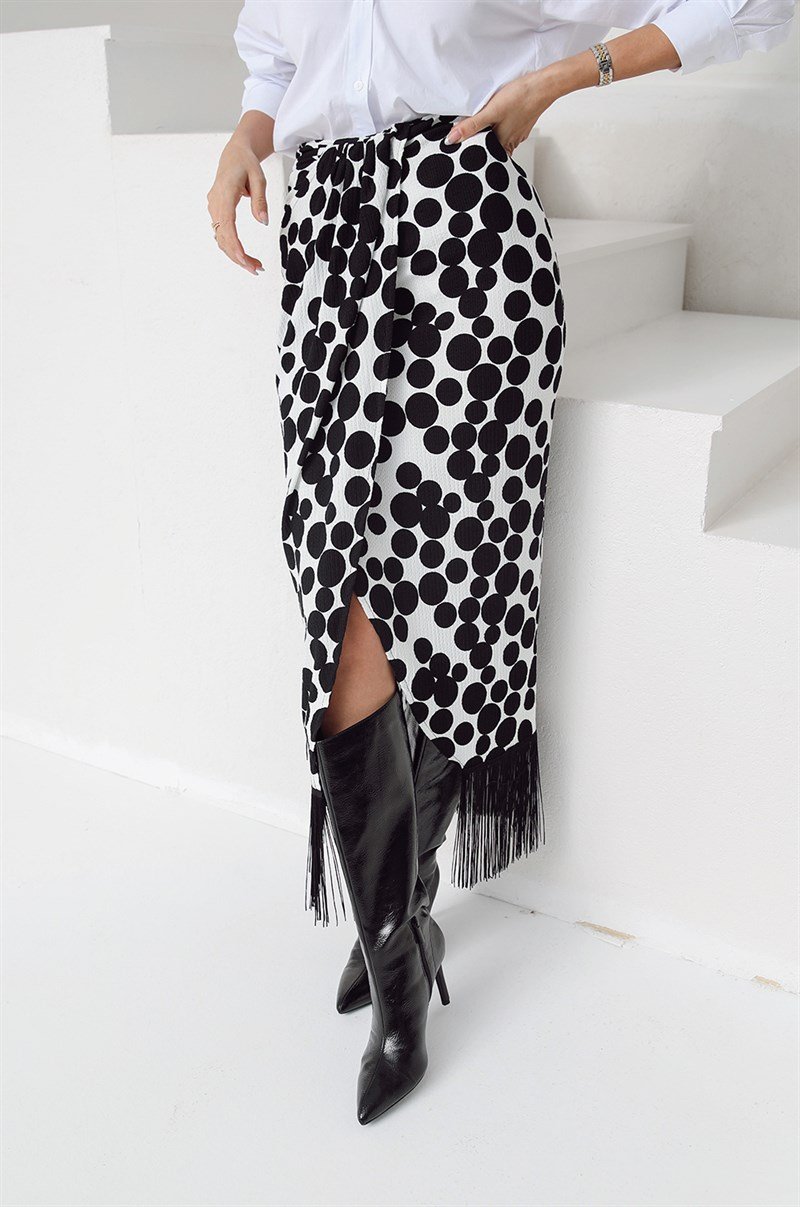 Deze elegante rok combineert speelsheid en verfijning in één design. De zwart-witte polkadotprint geeft een tijdloze en modieuze uitstraling, terwijl de franjes aan de zoom zorgen voor een trendy en opvallend detail. Dankzij het wikkelmodel sluit de rok mooi aan en biedt hij tegelijkertijd draagcomfort. Perfect te combineren met een blouse en hakken voor een chique look of met laarzen voor een meer casual stijl.