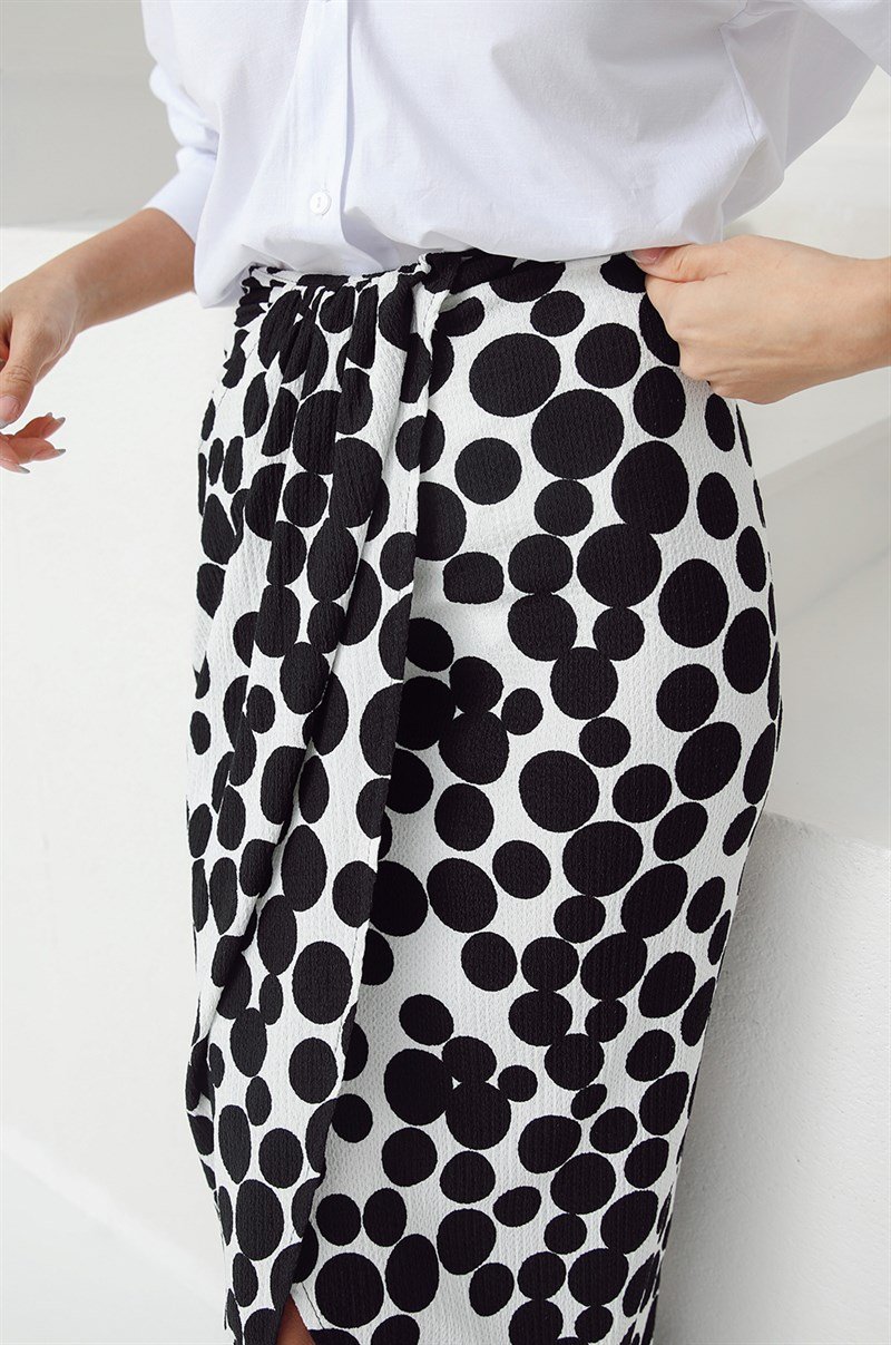 Deze elegante rok combineert speelsheid en verfijning in één design. De zwart-witte polkadotprint geeft een tijdloze en modieuze uitstraling, terwijl de franjes aan de zoom zorgen voor een trendy en opvallend detail. Dankzij het wikkelmodel sluit de rok mooi aan en biedt hij tegelijkertijd draagcomfort. Perfect te combineren met een blouse en hakken voor een chique look of met laarzen voor een meer casual stijl.