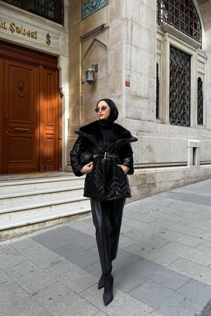 Deze elegante zwarte winterjas is ontworpen voor vrouwen die stijl en comfort willen combineren. De luxe zwarte bontkraag geeft de jas een chique en opvallende uitstraling, terwijl de gewatteerde structuur en de verstelbare tailleband zorgen voor een mooie en flatterende pasvorm.