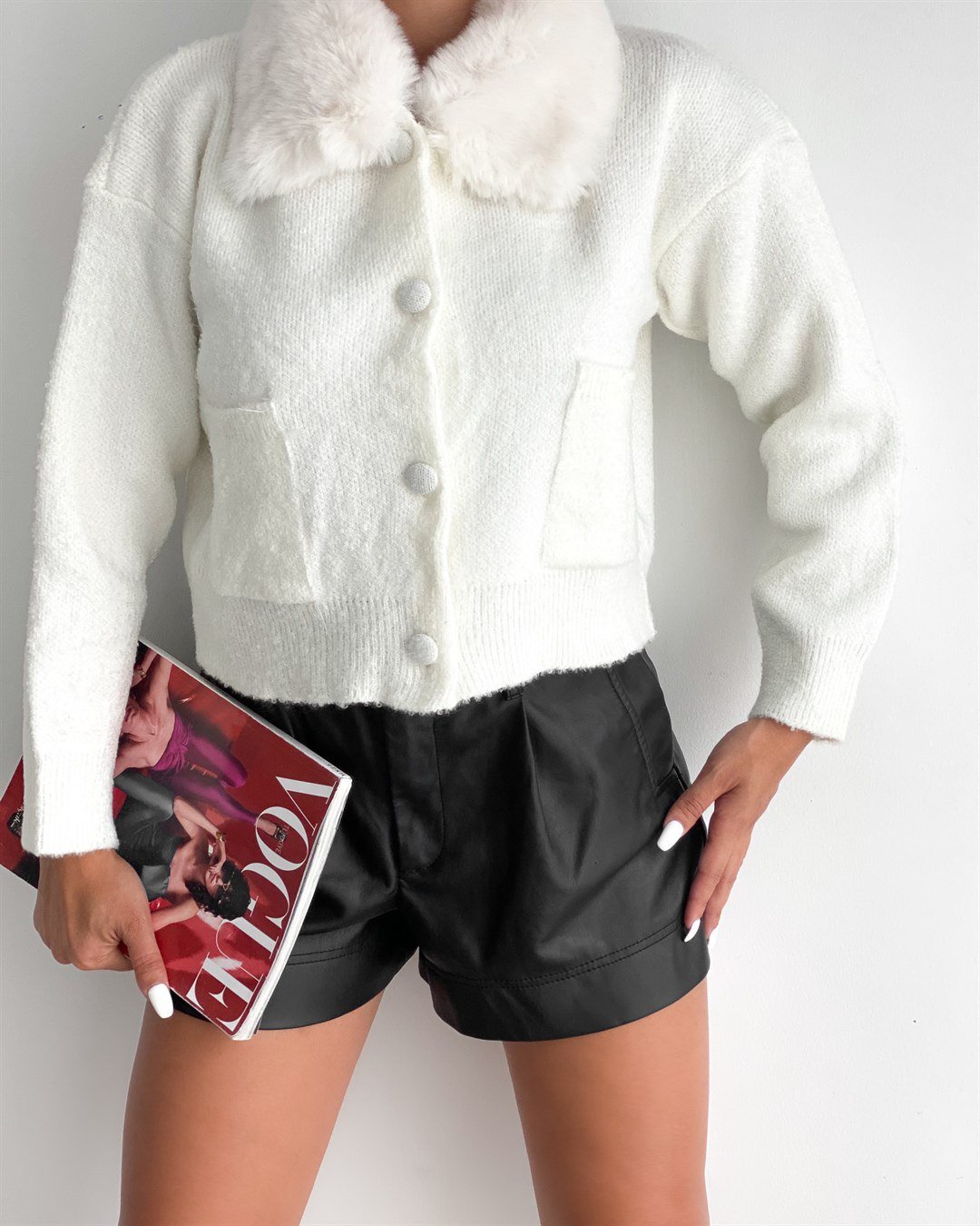 Dit witte gebreide vest combineert elegantie en warmte op koude dagen. Dankzij de afneembare bontkraag kun je het op twee verschillende manieren dragen. De zachte stof en comfortabele pasvorm zorgen ervoor dat je er stijlvol en ontspannen uitziet in je dagelijkse outfits. Met de knoopsluiting aan de voorkant en handige zakken is het zowel praktisch als modieus. Perfect te combineren met een jeans, rok of jurk om je garderobe een verfijnde touch te geven.