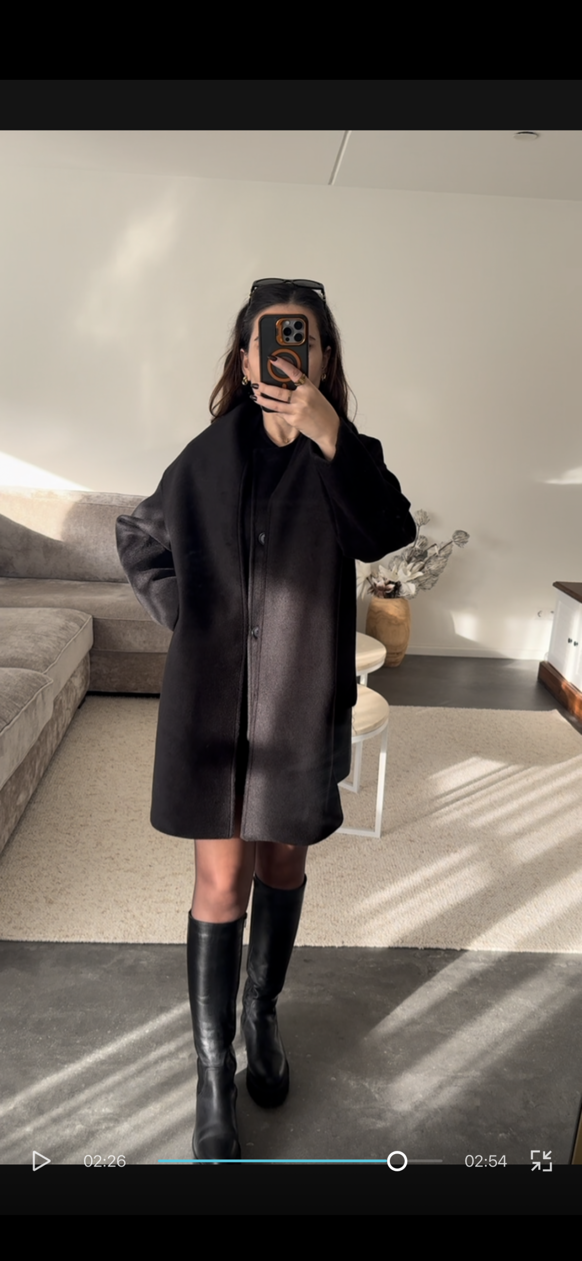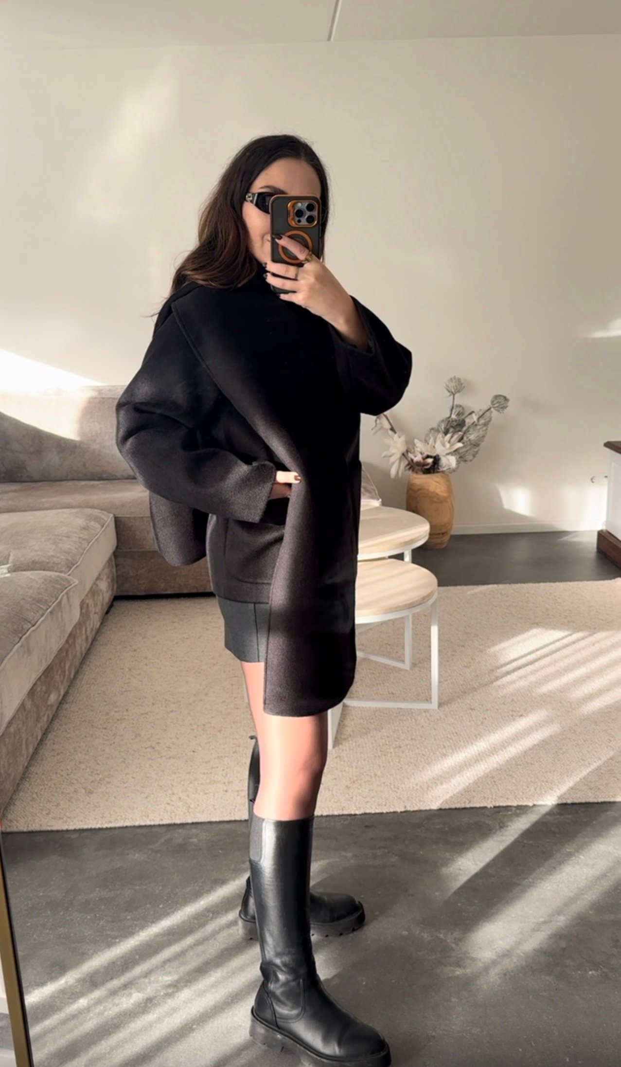 Deze stijlvolle zwarte jas combineert luxe en comfort in één ontwerp. Gemaakt van hoogwaardige materialen voor optimale warmte en duurzaamheid. De jas wordt geleverd met een elegante, bijpassende sjaal en beschikt over ruime, praktische zakken. Perfect voor elke dag én elke outfit.